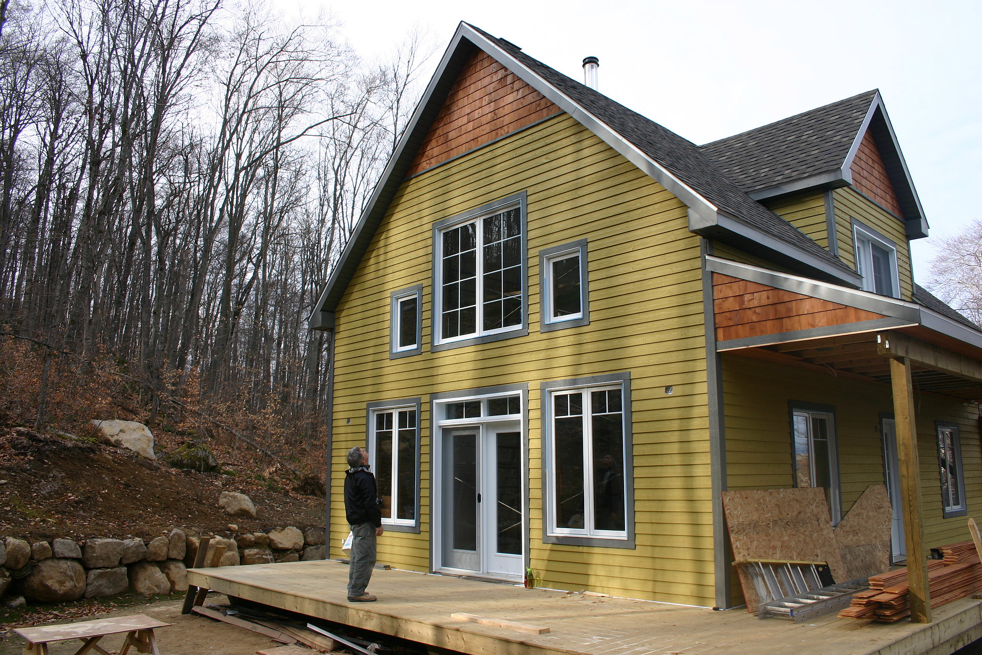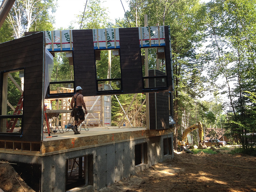 Nos murs sont constitués d'une structure de 2X8 aux 16 pouces, un panneaux de polystirène d'une épaisseur de 2 pouces et de 7,5 pouces d'isolation de fibre de cellulose en plus d'un panneaux enermax à l'intérieur le tout pour atteindre une valeur de R-40